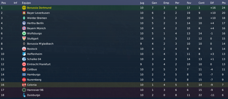 Muy bien los chicos del Dortmund 2, pese a ese comienzo ya hablado, volvieron a retomar el buen ritmo y nos encontramos terceros muy cerca de la cima. Creo que el equipo esta asentado bases poco a poco y los jugadores empiezan a tener una identidad diferente. Ya no importan nombres, vemos esto en el caso del rumano, lo supieron aguantar muy bien los suplentes.