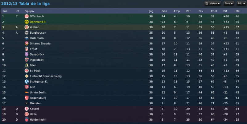 Fin de una excelente temporada para el Dortmund II. Pocos soñaban al inicio de este proyecto que podíamos llegar a pelear el torneo hasta el final en esta dura categoría, otorgando una mayor ventaja de edad aún que la obligada por las normas de la competencia. Se perdieron dos partidos en los últimos dos meses triunfando en todos los restantes, incluyendo goleadas para el recuerdo.