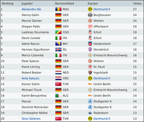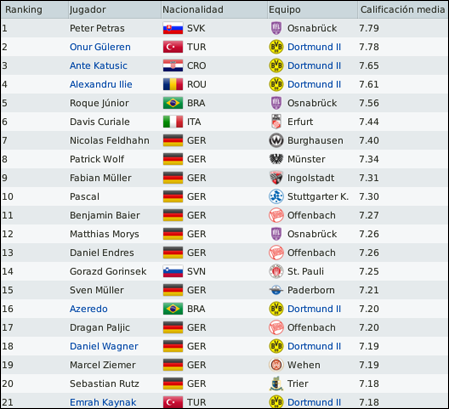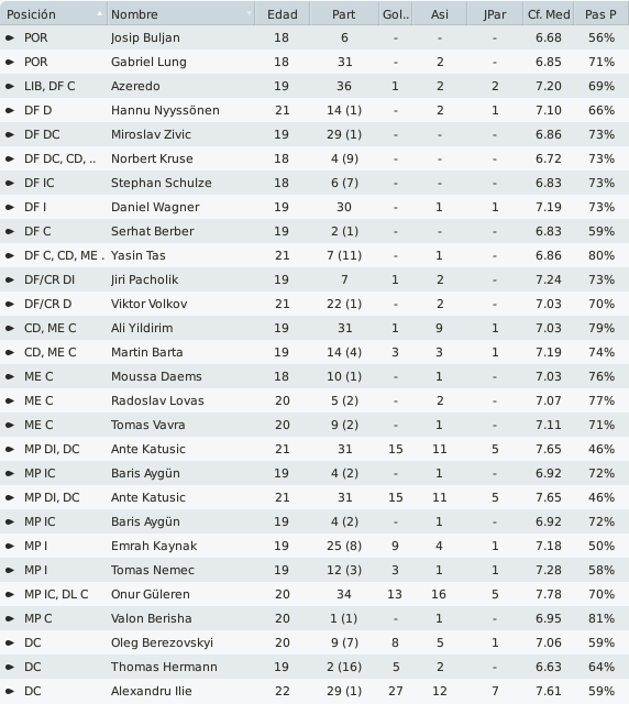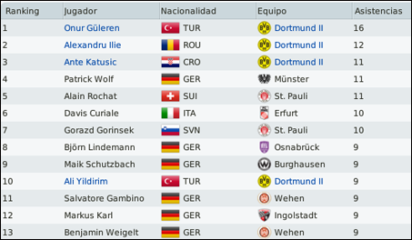 Estadísticas anuales del plantel de Dortmund II. / Goleadores 3. Liga / Calificación media / Asistentes