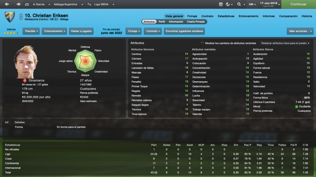 La posición a ocupar es la de MEC con el rol de Org. Adelantado, y estos son los atributos de Eriksen y de Suso