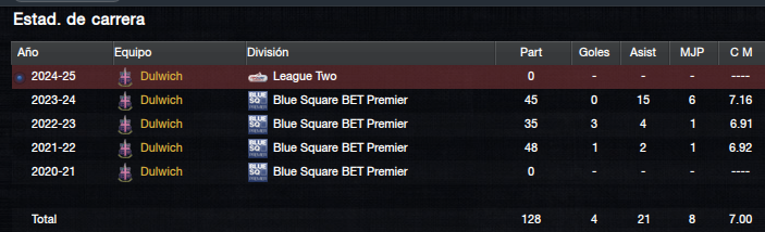 Febrero 27, 201411 años Autor ANÁLISIS DE LA PLANTILLA (I) Como le acabo de comentar a @Narvachus veo necesario un pequeño análisis de la materia prima canterana con la que cuento, para así os podais hacer una idea aproximada de cómo me voy a manejar en League Two y con qué tipo de futbolistas he contado en mis últimas temporadas en la Conference para competir. Al margen de este análisis puntual para ubicar al lector, la aventura seguirá su ritmo de actualización habitual de un resumen anual. Ahora mismo me encuentro en el mes de julio, sin haber comenzado la pretemporada. A falta de solucionar la situación de 2 jugadores marginales cuya continuidad en el equipo está en duda y que no los incluyo en el análisis, la primera plantilla del Dulwich Hamlet se compone de los siguientes sujetos. : : : : : : : : : : : : : : : : : : : : : : : : : : : : : : : : : : : : : : BILLY HARRIS-POR-25 años-PERFIL-CARRERA Portero de corte clásico que compensa su defecto de vivir sólo bajo palos con una buena agilidad y reflejos. Plenamente asentado como titular, encontró su oportunidad tras aquel de la BSP en el que decidí acometer un cambio en la portería. Lo aprovechó y desde entonces no se ha movido de mis alineaciones. PAT HALE-POR-23 años-PERFIL-CARRERA Portero suplente, claramente a la sombra de Harris aunque igualmente tiene minutos pues juega las copas. : : : : : : : : : : : : : : : : : : : : : : : : : : : : : : : : : : : : : : ESHABIL SIRIN-DF (DC), CD, MEC-19 años-PERFIL-CARRERA El mejor de la pareja de anglo-turcos. Originariamente centrocampista pero reconvertido a defensa central debido a necesidades del club en esta posición. Su debilidad física la compensa con un buen perfil técnico para lo que es el nivel BSP y L2. Se encarga del balón parado y es internacional sub21 por Turquía. PAT GAME-DFC-24 años-PERFIL-CARRERA La pareja de Sirin en la zaga, pone la fuerza y altura de la que carece el turco. Actúa como marcador clásico debido a que técnicamente es pésimo y a nivel mental tampoco es demasiado fiable. A pesar de todo se maneja siempre para cumplir. JERMAIN MacKENZIE-DF (DC)-29 años-PERFIL-CARRERA El "abuelo" de la plantilla, y único jugador que ha vivido todo el progreso del club desde el primer día. A pesar de que lo ascendí en la segunda temporada, ya debutó siendo todavía miembro del equipo juvenil, así que ha estado conmigo desde siempre, meritazo. Actualmente su rol es el de tercer central. JOEL FISHER-DFC-22 años-PERFIL-CARRERA Más malo que la carne de pescuezo. Pero la cantera no ha dado hasta el momento nada mejor. Y para cuarto central no vamos a pedir a Beckenbauer. A pesar de todos sus defectos, físicamente es un toro. : : : : : : : : : : : : : : : : : : : : : : : : : : : : : : : : : : : : : :