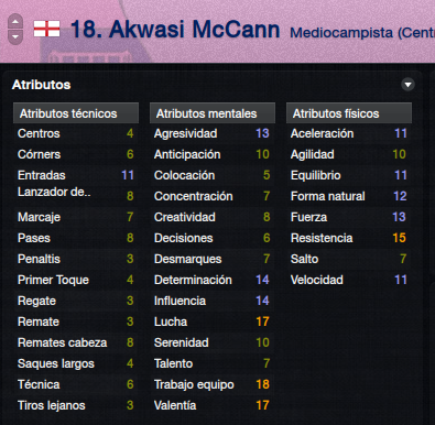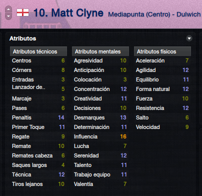Febrero 27, 201411 años Autor ANÁLISIS DE LA PLANTILLA (CENTROCAMPISTAS) AYHAN UYGUN-CD, ME/MP ©-19 años-PERFIL-CARRERA El otro turco. Actúa de pivote organizador, también de físico endeble al igual que su compatriota pero muy técnico. Personalmente para el doble pivote en nuestro sistema 4231 me gustan jugadores más de trabajo y poderío físico pero me tengo que adaptar al perfil de futbolistas que nacen de la cantera, y desperdiciar su potencial sería ridículo. BILO BIZIMANA-DFC, MEC-20 años-PERFIL-CARRERA Defensa central reciclado a centrocampista recuperador para formar pareja en el doble pivote con el turco. Tiene la presencia física necesaria para complementarlo. De nombre exótico, tiene la nacionalidad de Burundi además de la inglesa. AKWASI McCANN-DFC, CD, MEC-23 años-PERFIL-CARRERA Otro centrocampista recuperador cuya única labor es dar hostias y destruir fútbol. Algo más técnico que Bizimana, pero menos físico, cosa que le penaliza. En anteriores temporadas ha sido indiscutible pero ya no tiene ese status. : : : : : : : : : : : : : : : : : : : : : : : : : : : : : : : : : : : : : : MATT CLYNE-MPC-27 años-PERFIL-CARRERA Capitán del equipo, es nuestro enganche actuando en la mediapunta del 4231. Bastante vago defendiendo, egoísta y lento. Para que no se enoje diremos también que tiene gol, técnicamente bastante bueno y que se crece en los grandes partidos. Ha hecho una buena carrera en el club, muchos partidos disputados. TERRY FURLONG-DC-19 años-PERFIL-CARRERA Delantero al que estoy reciclando a mediapunta pues es muy fallón en el remate, en cambio si juega algo más retrasado puede ser un recambio potable para Clyne hasta que encontremos mejores soluciones. : : : : : : : : : : : : : : : : : : : : : : : : : : : : : : : : : : : : : :