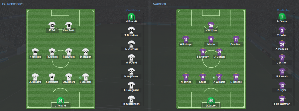 En cuanto al equipo de Pepe Mel tiene disponible a toda la plantilla para el enfrentamiento. Se espera un partido muy disputado en el que el Swansea tiene una buena ventaja del partido de ida y no tendría que arriesgar mucho y el Copenhague sacará sus armas para conseguir por lo menos los tres goles que los puedan meter en la prórroga.