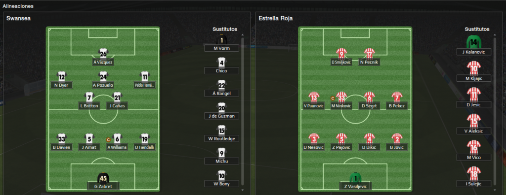 Pozuelo esta increíble me gusta como se mueve en esa posición, lo puse de titular contra el estrella roja y dio muy buenos pases a Bony pero lo tuve que sustituir porque estaba completamente agotado. Va jugar de nuevo de titular en gales frente al equipo serbio. Es un pedazo de recambio para Michu. Sobre Lamah no se para cuanto tiempo estará aun no me lo marca pero espero que para poco ya que viene siendo un jugador muy importante y ahora mismo Dyer no lo veo capacitado para ser titular. A este ultimo si llega una oferta se ira.