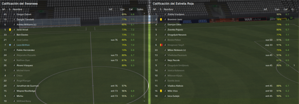 La segunda parte empezó con un claro dominio del Swansea que consiguió el empate a los 49 minutos después de que el jugador serbio Dikic mandase el balón al fondo de su propia portería. El gol en propia puerto llego tras un saque de falta sacada por Britton que remato Dyer y el balón toco en el serbio Dilic y acabo entrando en la portería. El equipo gales lo siguió intentado pero durante los otros 40 minutos no se pudieron poner por delante, el Estrella Rojo con un jugador menos solo se podía defender. El mejor jugador del partido fue para el mediocentro Britton que hasta ahora no había dispuesto de muchos minutos con el equipo gales.