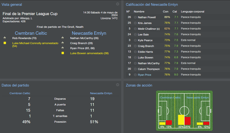En final tuvimos un choque fácil dentro de los pronósticos, el rival era el Cwmbram Celtic, que no tuvo opciones en ningún momento del partido y vencimos por 4 a 1.