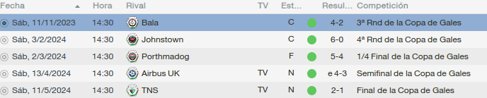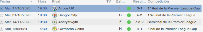 En tercera ronda despachamos al Bala con un 4-2, en cuarta ronda fue mas fácil pasar sobre el Johnstown, con un resultado de 6-0. En cuartos nos complico el Porthmadog, pero los superamos por un 5 a 4.