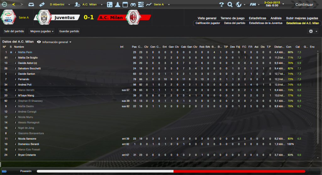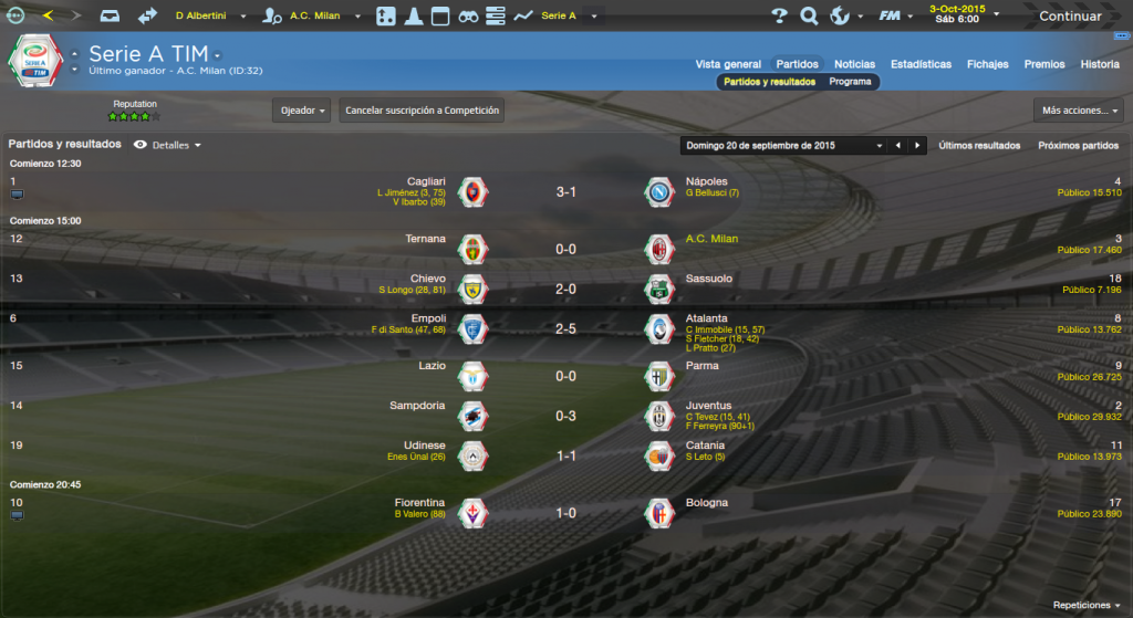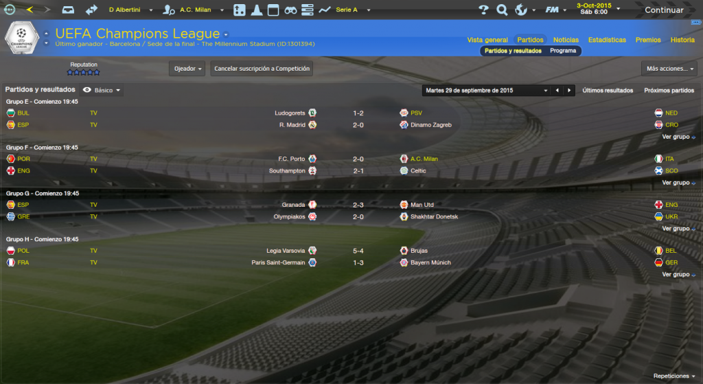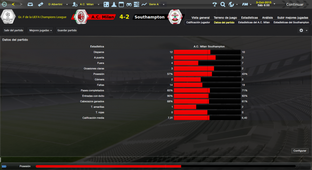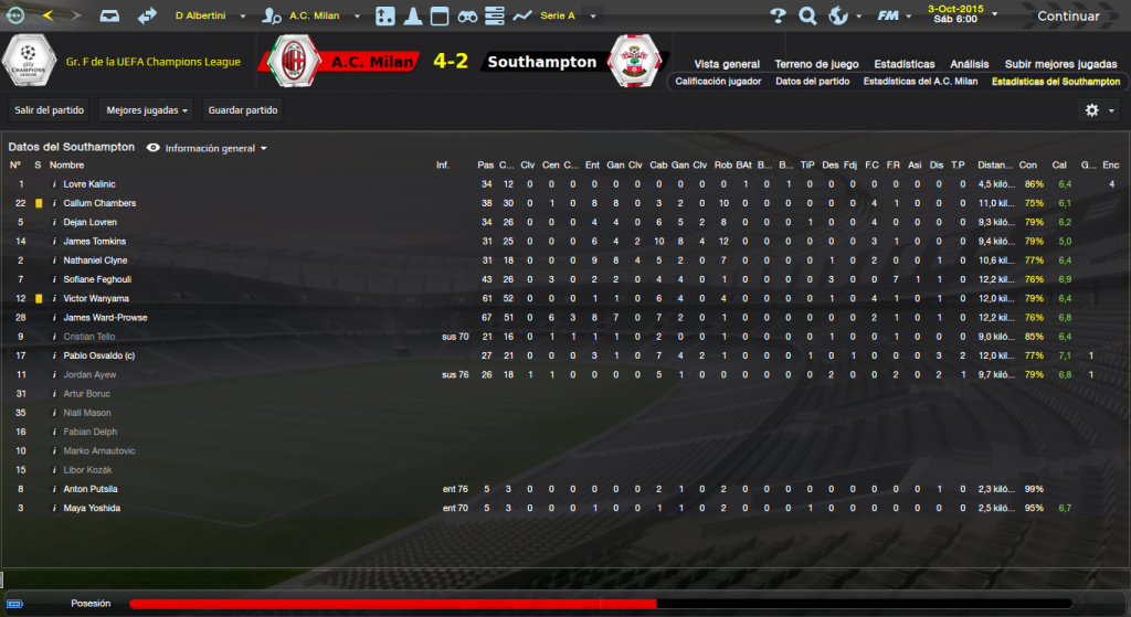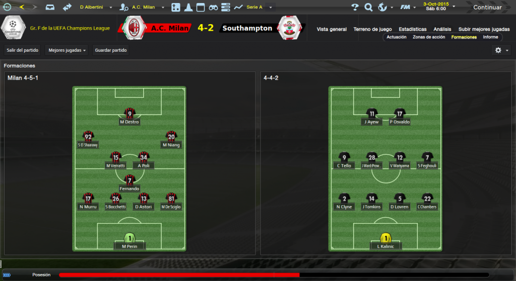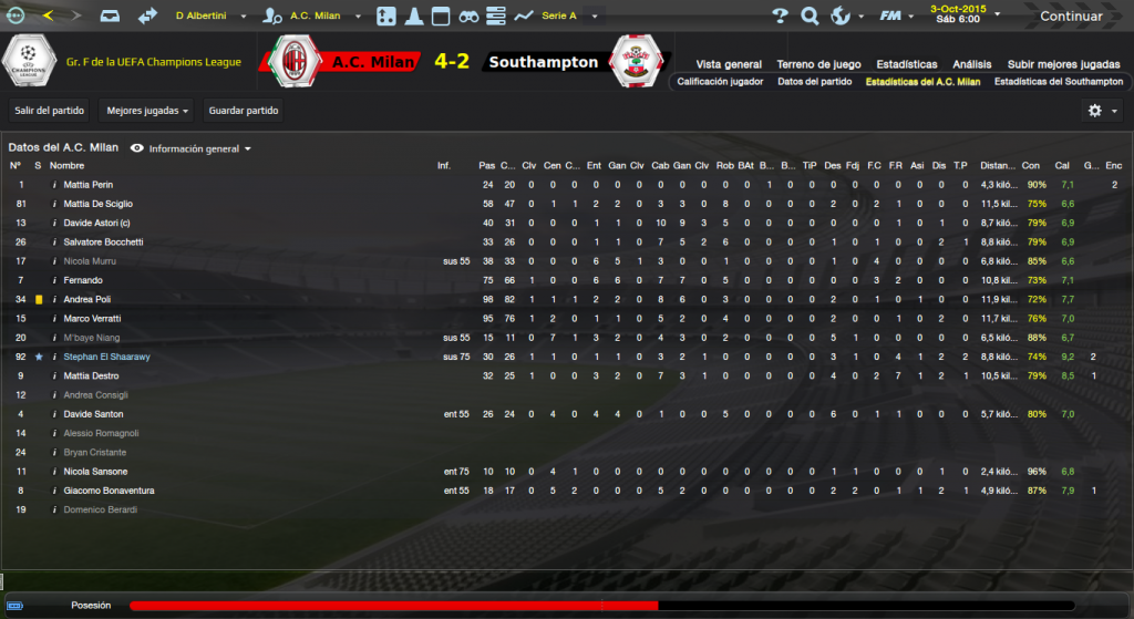 Un encuentro muy raro tuvo lugar en nuestro debut por la Champions League ante el Southampton. En los primeros 5 minutos lográbamos sacar dos goles de ventaja, por medio de El Shaarawy y Destro (su primer gol de la temporada), pero antes de los 10 minutos Osvaldo descontaba diferencias, y antes de terminar la primera parte, un penal evitable por parte de De Sciglio le daba la chance a Ayew para empatar las cosas. Teníamos el control del partido por medio de la posesión de la pelota, pero algunas distracciones en defensa daban la chance a los jugadores rivales de tener sus oportunidades. En la segunda parte, mas que nada con la entrada de Bonaventura en lugar de Niang, le dio otro impulso a la ofensiva, y en 10 minutos el mismo Bonaventura y El Shaarawy lograron sacar la ventaja definitiva. Perin tuvo otra buena actuación, a pesar de los dos goles recibidos, pero cuando pudo intervenir, lo hizo de buena manera. Otro gran partido del mediocampo, donde Fernando se sumó a las buenas actuaciones de Poli y Verratti, que entre los 3 superaron el 80% de pases bien dados. Y arriba aparecieron El Shaarawy y Destro, con 3 goles y dos asistencias entre los dos jugadores, empezando a disipar las dudas que se tenían en las primeras fechas. En el otro encuentro del grupo, el Celtic dio la sorpresa al vencer por 1-0 al Porto en Glasgow, por lo que compartimos la punta con los escoceses, pero ubicados en la primera colocación por la diferencia de gol.