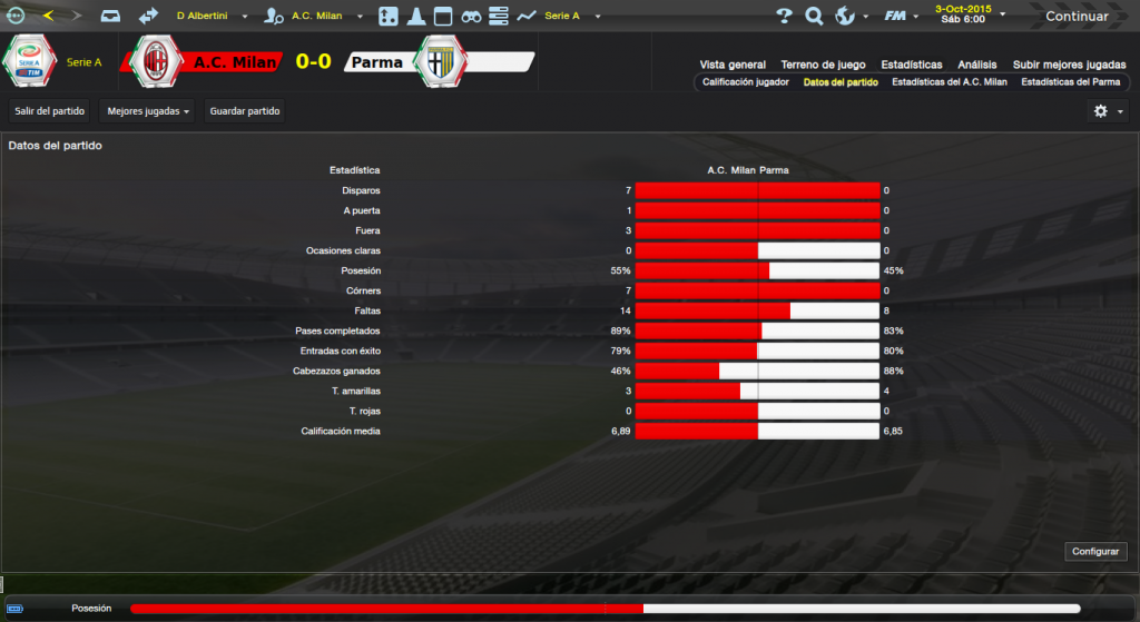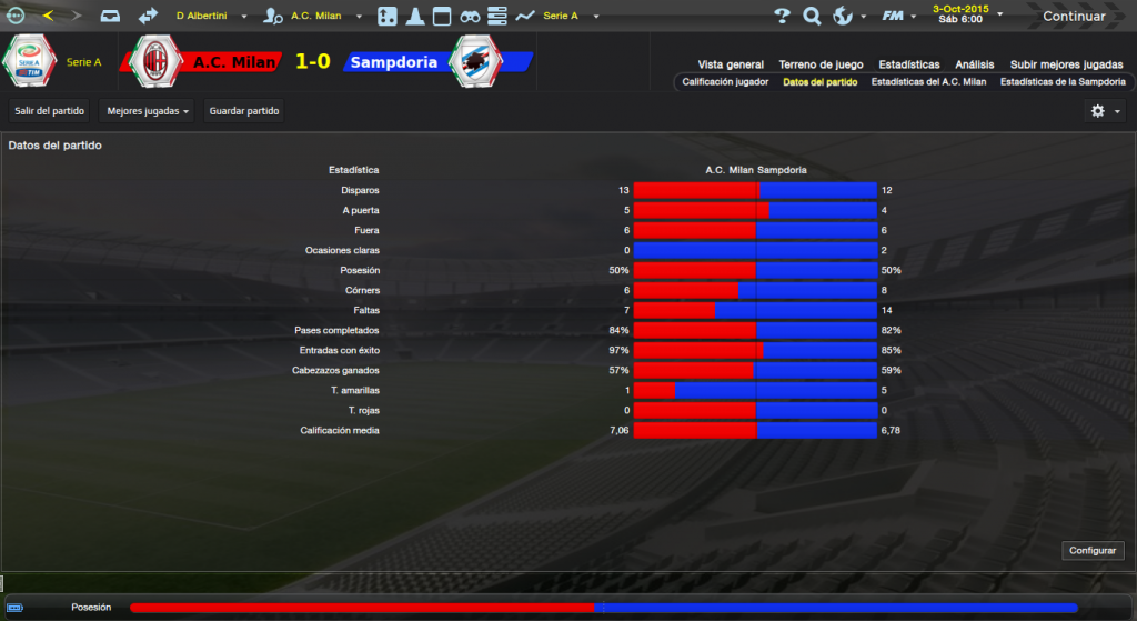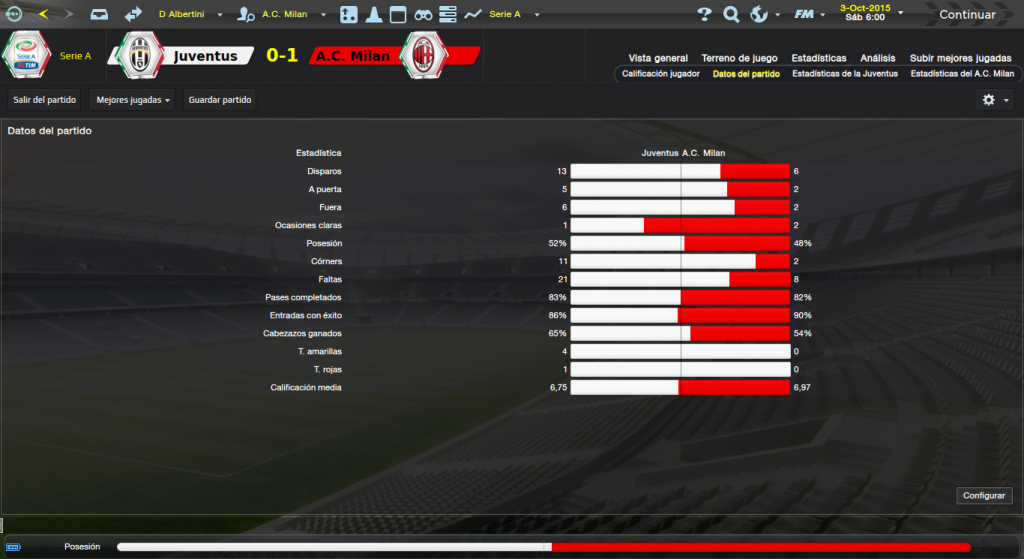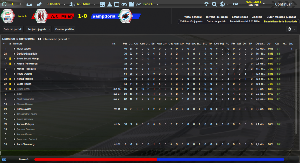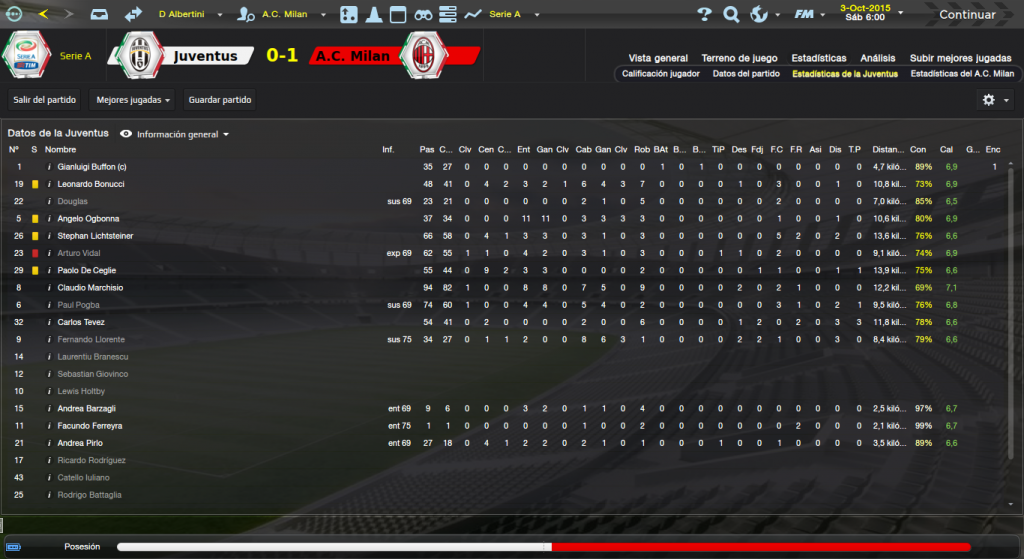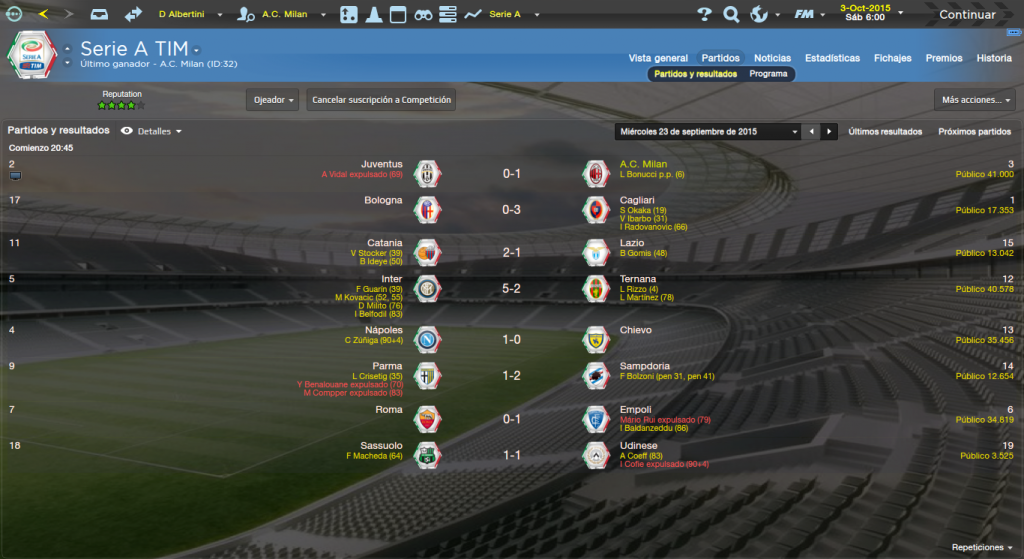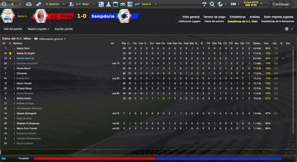 Un encuentro muy raro tuvo lugar en nuestro debut por la Champions League ante el Southampton. En los primeros 5 minutos lográbamos sacar dos goles de ventaja, por medio de El Shaarawy y Destro (su primer gol de la temporada), pero antes de los 10 minutos Osvaldo descontaba diferencias, y antes de terminar la primera parte, un penal evitable por parte de De Sciglio le daba la chance a Ayew para empatar las cosas. Teníamos el control del partido por medio de la posesión de la pelota, pero algunas distracciones en defensa daban la chance a los jugadores rivales de tener sus oportunidades. En la segunda parte, mas que nada con la entrada de Bonaventura en lugar de Niang, le dio otro impulso a la ofensiva, y en 10 minutos el mismo Bonaventura y El Shaarawy lograron sacar la ventaja definitiva. Perin tuvo otra buena actuación, a pesar de los dos goles recibidos, pero cuando pudo intervenir, lo hizo de buena manera. Otro gran partido del mediocampo, donde Fernando se sumó a las buenas actuaciones de Poli y Verratti, que entre los 3 superaron el 80% de pases bien dados. Y arriba aparecieron El Shaarawy y Destro, con 3 goles y dos asistencias entre los dos jugadores, empezando a disipar las dudas que se tenían en las primeras fechas. En el otro encuentro del grupo, el Celtic dio la sorpresa al vencer por 1-0 al Porto en Glasgow, por lo que compartimos la punta con los escoceses, pero ubicados en la primera colocación por la diferencia de gol.