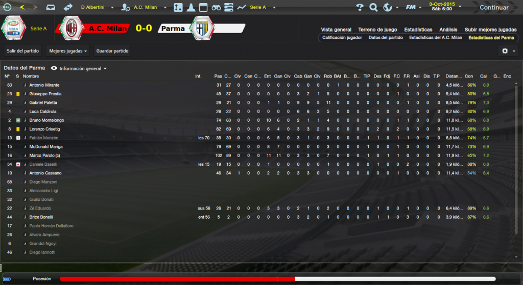 Pensando en el partido de Champions en unos dias más, nuevamente realizábamos unos cambios para rotar los jugadores y no cargarlos de partidos, pero nuevamente dejamos puntos en el camino ante un Parma que vino a buscar el empate, y lo logró. Un encuentro bastante discreto, donde apenas hubieron chances de gol, pero todas de nuestra parte, ya que el equipo visitante no pudo ni acercarse al arco de Consigli (debut oficial para el arquero llegado de Atalanta). El mejor jugador del encuentro fue Nigel de Jong, que esta mostrándose bien en este nuevo rol de rotación, y nos viene bien para que se muestre en buena forma, para que despierte el interés de algunos equipos. Pero nuevamente fallamos en la creación de peligro. El mediocampo estuvo mucho más activo y preciso que en otras ocasiones (Fosatti mejoró mucho respecto al anterior encuentro contra Ternana) pero no hubo conexión con los extremos y el delantero centro. Ya es el tercer partido consecutivo en el cual no podemos marcar goles (contra Juventus fue un gol en contra) y es algo que puede ser perjudicial para el equipo de cara a los próximos partidos.