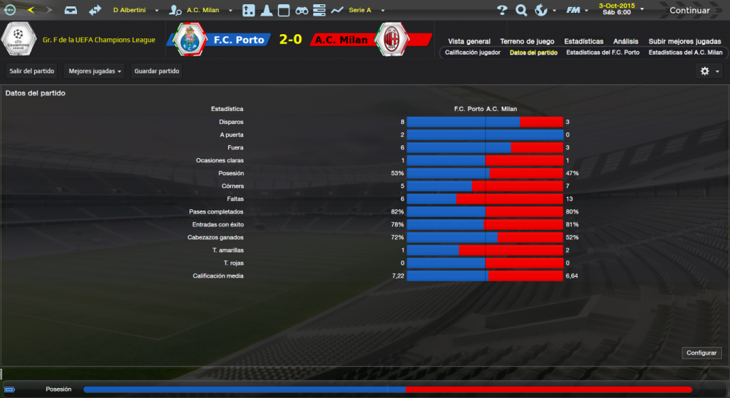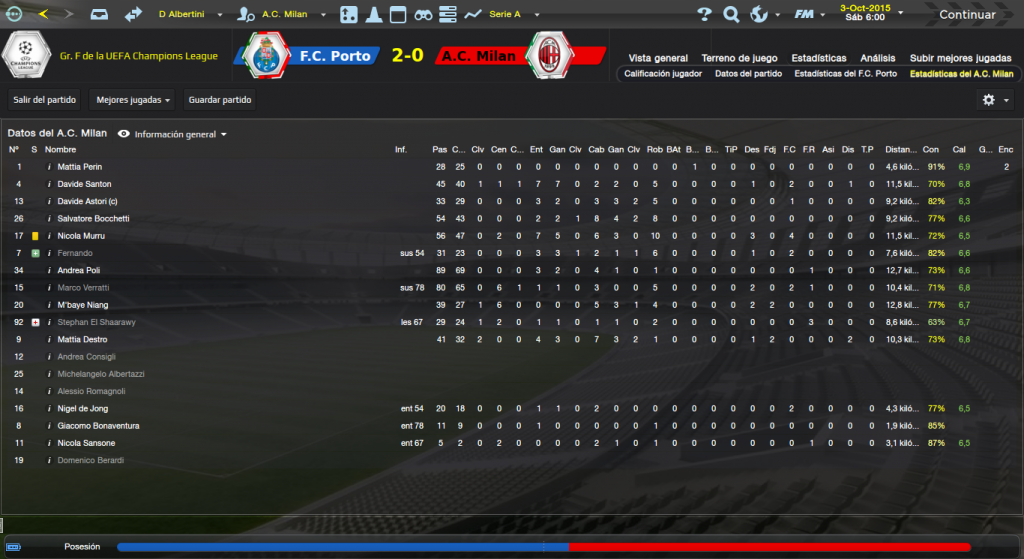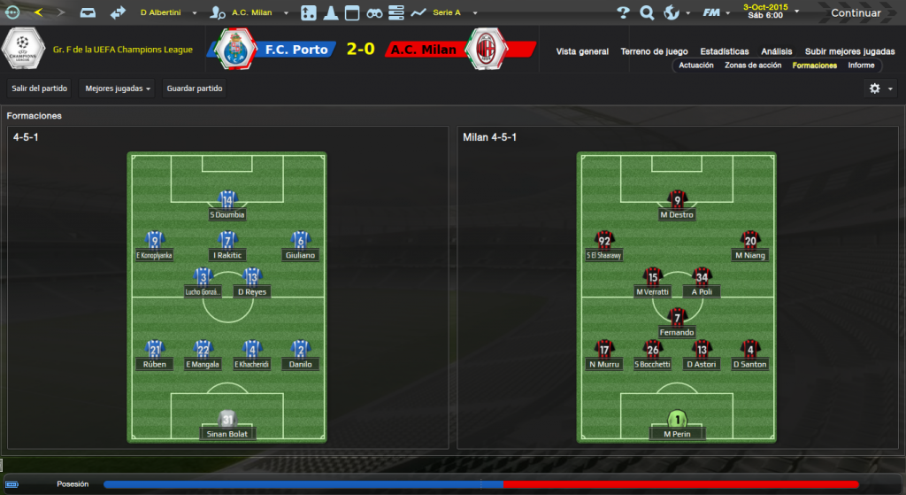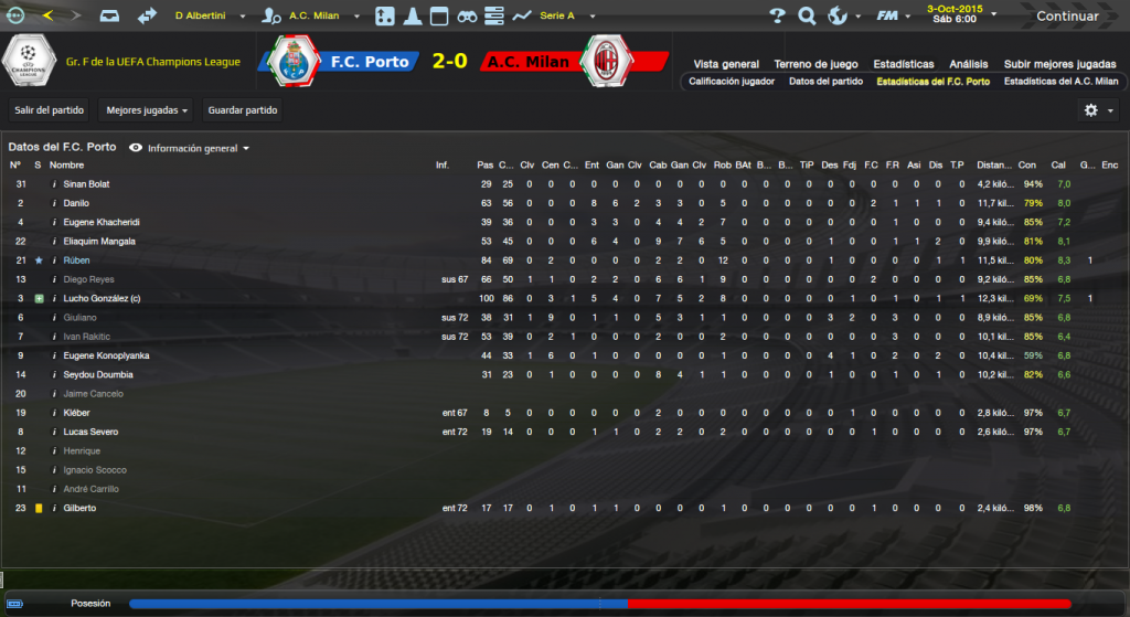 Tropiezo en la visita a Portugal al enfrentarnos a Porto en su estadio. Otro partido donde los equipos no tenían muchas chances de gol, pero nosotros apenas si logramos generar 3 en todo el partido. Y el Porto recién en los últimos 15 minutos pudo plasmar en el resultado la diferencia que tenía en el juego, con los goles de Ruben y Lucho Gonzalez de penal. Fue un partido bastante mediocre en todas las lineas del equipo, donde lo peor se vio en los centrales, con Astori cometiendo el penal que derivó en el segundo gol. Los mediocampistas estuvieron muy imprecisos a la hora de generar juego, por debajo del 80% de los pases completados. También hay que sumarle las lesiones de Fernando y El Shaarawy, que obligaron a cambios que no estaban pensados desde un principio, y que pudieron contribuir al desenlace final. Por suerte la derrota no fue tan grave al ver que en el otro encuentro el Southampton logró imponerse por 2-1 como local, por lo que todos estamos igualados en 3 puntos, quedando mucho todavía por delante, y dependemos de nosotros mismos para hacernos con ese primer lugar que tanto ansiamos.