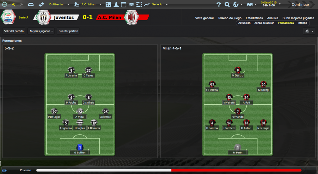 Si alguien pregunta como es el fútbol del Calcio, ésta es la mejor representación. Un gol en contra a los 6 minutos de Bonucci y a defender la ventaja durante el resto del encuentro. Así se vio el encuentro ante Juventus, donde estaba en juego la punta del torneo, y con ese único gol nos pudimos llevar una victoria importantísima, que nos deja solos en la punta de la liga. La figura del equipo fue Perin, con otra gran actuación para mantener la valla invicta, llegando a 5 fechas sin recibir goles (450 minutos). También fue clave la actuación de la defensa, de buen nivel nuevamente, sumando a Fernando en esta faceta, impidiendo que el juego de la Juve sea del todo limpio. La defensa local también hizo un buen trabajo, anulando a Destro y El Shaarawy, sin chances de gol en todo el encuentro hasta que fueron reemplazados, como tampoco tuvieron sus reemplazantes. Pero poco importa después de conseguir una victoria vital frente a uno de los candidatos al título, la segunda conseguida de 7 encuentros disputados desde que llegamos al club.
