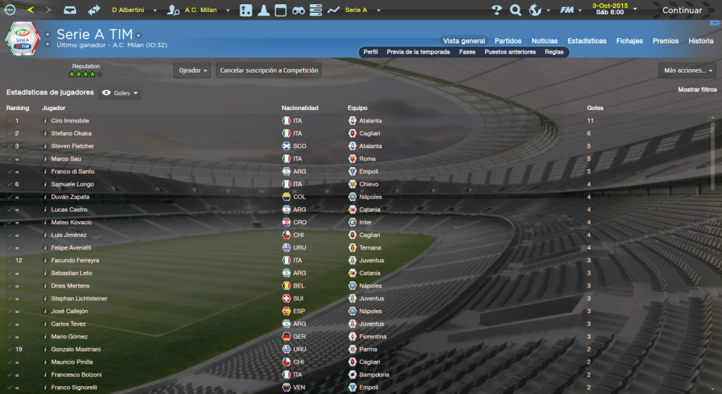 Aun no metimos la quinta marcha según parece, esperemos que esta nueva temporada no sea la que se nos atragante y pronto podamos demostrar que somos el mejor equipo del Calcio. Esos dos empates nos quitaron valioso puntos para coger la cima de la tabla aunque aún es muy pronto y la Juve sólo nos aventaja en uno. Sorprendente ver al Cagliari en ese primer lugar, se ve que comenzaron el año muy bien y ahora lo que todo el mundo quiere ver es si podrán mantener un nivel alto/medio durante toda la temporada o bajarán este arranque y se posicionarán en una zona más acorde a sus objetivos, estaremos atentos.