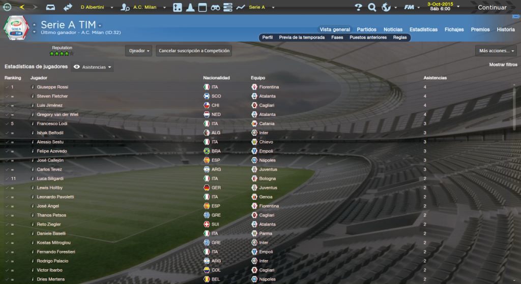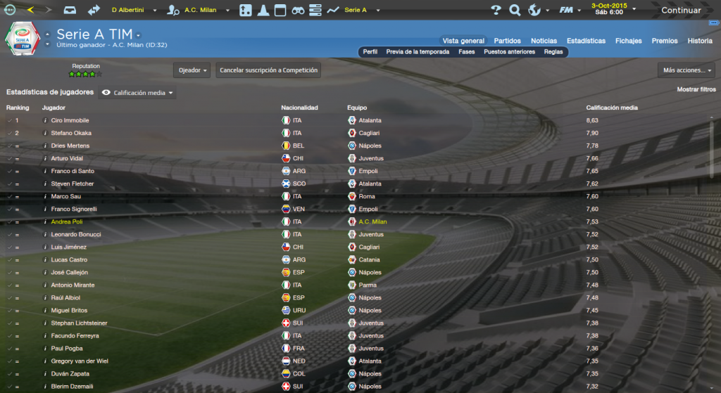 En Italia terminamos muy comodos, sacando nuevamente una gran diferencia en el torneo. El plantel se ha visto muy favorecido con los cambios que venimos haciendo desde que llegamos, y la verdad que me pone muy contento que la apuesta este saliendo de la mejor manera, aunque sea en el plano local. Logramos mayor solidez defensiva, aunque todavia no logremos ser el equipo menos goleado, pero los premios dan la pauta que estamos en buen camino. Y El Shaarawy nuevamente como mejor jugador de la liga hace que los mejores equipos de Europa empiecen a interesarse en el. Obviamente que no pensamos venderlo salvo que la oferta sea irresistible, del estilo Doria con esa cantidad de plata. Niang sigue creciendo temporada tras temporada, y se esta haciendo un jugador importante del equipo. Y Bonaventura mete presion desde atras, porque tambien es un gran jugador, y ya empieza a pedir su lugar en el once, cosa que todavia no lo tiene por el nivel de los jugadores que estan adentro. Ni hablar de la dupla Poli-Verratti, de las mejores del continente, a mi parecer, pero va siendo hora que lo demuestren en la Champions.