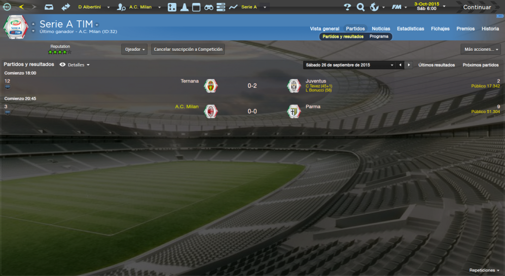 Se empezo de la mejor manera, aunque algo ajustado en los resultados finales. La Supercopa se nos dio nuevamente en un partido que fue parejo, pero sacamos la diferencia y recien sobre el final lograron el descuento, que poco sirvio. Y dos victorias importantes, ante equipos que pueden complicarte la tarde en la Serie A si no estas atento. Me preocupa porque quiero que los delanteros sean los que mas goles aporten al equipo, y en los partidos que llevamos jugados la verdad que no estan teniendo las mejores actuaciones. Supongo que sera por lo pagado por Destro y que la temporada pasada, en lo que jugo, llevaba un gran promedio de gol. Pero es como decis, mientras los goles aparezcan por medio de los centrocampistas y mantengamos el cero en el nuestro, no deberia preocuparme demasiado. Como bien decis, this is Calcio xD