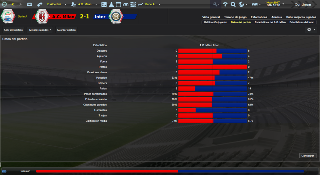 Tengo la duda de que vas a querer hacer cuando termine la temporada:seguir la historia buscando revancha y el dominio rossonero en el mundo o retirarte y animarte a ver nuevos horizontes con otra historia. Yo preferiría la segunda opción ya que se consiguió desbancar la monotomía de la Juventus en la Serie A para marcar un época en el Milan pero obvio si queres seguir esta excelente historia estaremos felices de ver un nuevo episodio jajaja.