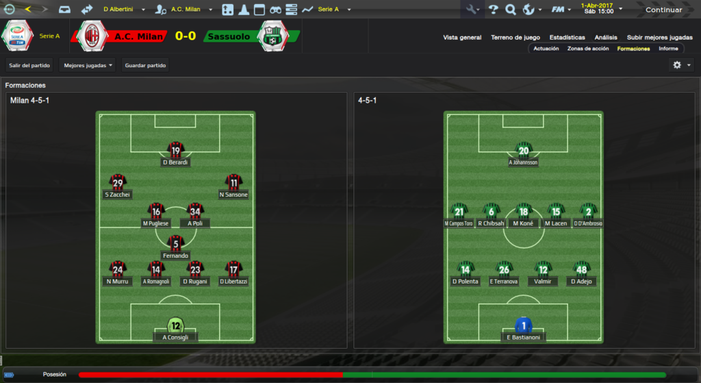 Tras la obtencion del titulo en la fecha anterior, dispusimos poner un equipo alternativo para enfrentar al Sassuolo en su estadio. Pensabamos que esta formacion iba a estar a la altura para seguir sumando puntos, pero a pesar de contar con chances, terminamos perdiendo por la minima diferencia. Campos Toro fue el goleador del equipo local para sumar 3 puntos que lo alejaron definitivamente de cualquier posibilidad de descenso en esta temporada. Nosotros contamos con el doble de chances para marcar, pero la mala definicion de los ataques fueron una de las claves para explicar la derrota. Un partido bastante regular por parte de los suplentes del equipo, que no estuvieron en su mejor momento, tanto en defensa como en ataque. Ademas se suma a que algunos jugadores pueden estar teniendo sus ultimas chances de demostrar por que deberian tener un lugar asegurado en la proxima temporada, pero con estas actuaciones solo se acercan a la salida del equipo. No hay nada confirmado pero es un rumor muy fuerte que Sansone y Fernando podrian ser los primeros en dejar el equipo. Lo de Sansone responde mas que nada a una apuesta por Zacchei, el juvenil que llego del Siena y que tiene potencial para superar al mediapunta que hace 3 temporadas llegaba al Milan. Por su lado, Fernando estaria tapando ya el crecimiento que viene teniendo Pugliese, desplazandolo de su posicion natural como mediocentro, y que seria el mejor momento para sacarle algo de plata despues de haber llegado por €8 millones y estar valorado por encima de los €13 millones en este momento.
