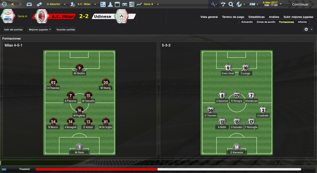 Tras el mal partido de Champions en mitad de semana, saliamos a buscar dar vuelta las cosas frente a un rival en dificultades como el Udinese, que nos visitaba en el San Siro. El equipo visitante llegaba con problemas con el descenso, peleando por mantener la categoria y todo hacia pensar que el partido tenia que ser accesible para nosotros. Pero nos sorprendieron en la primera etapa, logrando sacar dos goles de ventaja antes de los 25 minutos. Pero los siguientes 20 iban a ser aun peores, porque ibamos a tener dos penales a nuestro favor, que nos daban la chance de empatar el encuentro, pero Destro termino desperdiciando ambos, haciendo parecer que el partido ya estaba sentenciado a pesar de lo que pudiesemos hacer. En el complemento ibamos a empezar a corregir las cosas cuando Rolin convertia en su propia valla, dandonos el descuento que nos metia nuevamente en el partido. Y Destro iba a terminar teniendo su revancha, a falta de 10 minutos para el final, empatando el encuentro y poniendo a salvo el invicto que llevabamos hasta el momento de 12 encuentros con este resultado. Un encuentro donde el Milan se lo noto golpeado por el partido de Champions, donde ninguno de los jugadores tuvo respuestas dentro de la cancha, y donde la suerte no acompaño, porque uno de los penales que hubiese convertido Destro nos daba la victoria. Dejamos dos puntos que no estaban en los planes de nadie, y le da la chance a nuestros perseguidores de recortar diferencias respecto a nosotros.