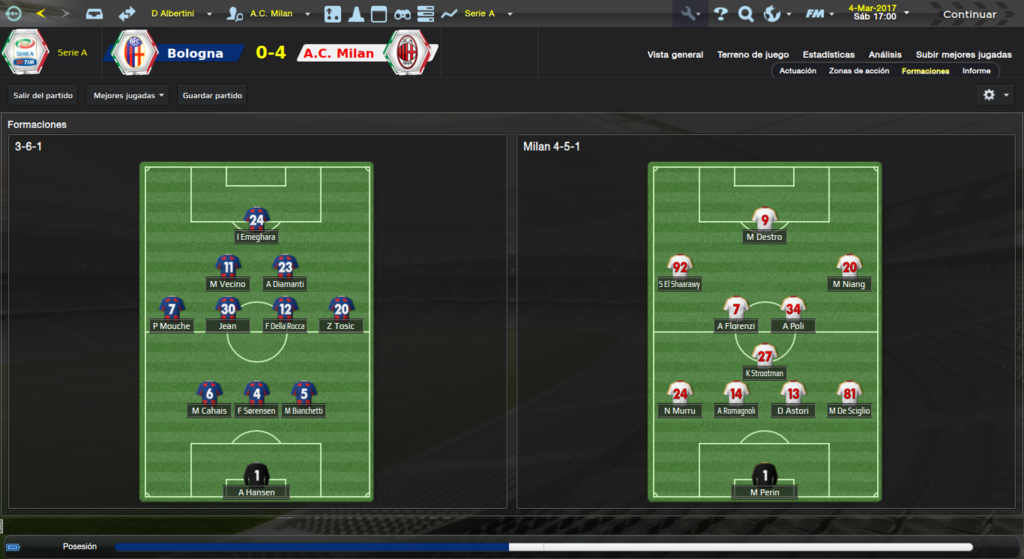 La visita al Bologna en su estadio era la oportunidad perfecta para volver al triunfo y devolverle la confianza a un equipo que, de pronto, parecia haberse olvidado de todo lo bueno que venia haciendo. El equipo local estaba peleando por la permanencia, y tenia obligaciones para sumar de a tres frente a su publico si quiere mantener la categoria. Nosotros teniamos que aprovecharnos de eso, y presentabamos el mismo equipo que la fecha pasada, solo con la salida de Santon por Nicola Murru. Iba a costar abrir el marcador, pero iba a llegar en el tiempo de descuento del primer tiempo, por medio de Niang, momento clave para irnos con la ventaja al descanso. Eso iba a descalabrar los planes del Bologna, que en los primeros minutos del complemento iba a sufrir los goles de Romagnoli y Berardi, dandonos una ventaja indescontable para el conjunto local. Y finalmente El Shaarawy, de penal, iba a cerrar el resultado cuando quedaban todavia 25 minutos por jugarse. La mala noticia iba a ser por parte de Niang, que salia lesionado cuando quedaban 6 minutos, con un golpe en la rotula, que lo dejara sin chances de estar para la vuelta del encuentro frente al Celtic, dentro de 2 semanas. Una gran performance de todo el equipo, que tuvo sus puntos altos en Romagnoli y Niang, jugadores que jugaron por encima de los 9 puntos. La defensa, una vez mas, fue la linea mas importante del equipo, manteniendo el cero en nuestro arco un partido mas, que nos permite seguir siendo de las vallas menos vencidas del torneo.