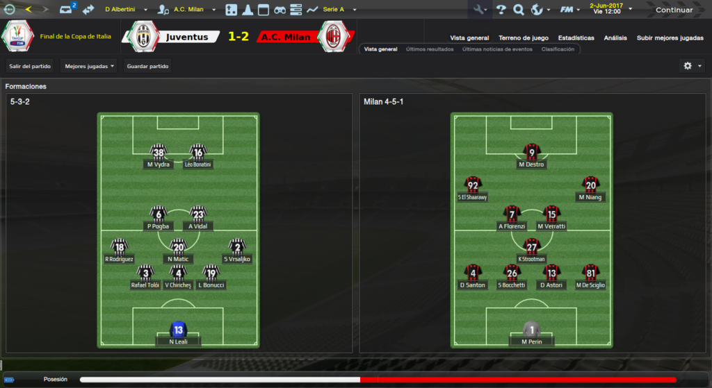 Era el partido perfecto para el cierre de la temporada en Italia, los dos mejores equipos del pais se enfrentaban por el titulo de copa domestico, como si fuese la final del Mundial. Mucha expectativa habia en este enfrentamiento, mas que nada por la superioridad que habiamos logrado demostrar sobre este equipo en los ultimos enfrentamientos directos, pero tambien por la posibilidad de que la Juve pueda gritar campeon despues de 4 años de sequia. Poniamos nuestro 11 de gala, no nos guardabamos nada en el banco, pero la Juve de Conte preferia la juventud antes que la experiencia, dejando en el banco o fuera de los convocados a gente como Marchisio, Tevez, Xabi Alonso, Buffon, Chiellini o Barzagli. La apuesta le termino costando cara a la Juve, porque en 30 minutos el partido estaba liquidado, con un doblete de Destro, que lograba convertir en su primer encuentro por copa. Ibamos a dominar el encuentro, y recien faltando 15 minutos descontaria Tevez, que entraba en el complemento para reforzar la equivocacion de Conte al no ponerlo entre los titulares. Obviamente que la figura del encuentro fue Destro con el doblete convertido, pero tambien se destaco por sobre el resto Marco Verratti, que colaboro con una asistencia y manejo los hilos del equipo en la mitad de cancha. Una gran actuacion del equipo que logro alzarse con su 7ª Coppa Italia en su historia, y cerrar con un doblete una temporada que en lo domestico no tuvo rival, pero en Europa dejo sabor a poco.