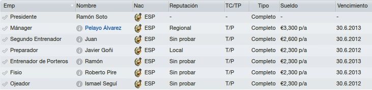 La nómina de empleados es sobresaliente tratándose de un equipo de esta categoría. Un segundo entrenador, un preparador, un entrenador de porteros, un fisio y un ojeador. Un equipo perfecto y con el salario mínimo (2.300€/año) que no queremos desmantelar, puesto que cuento con lograr el ascenso este año y seguir con este grupo hasta alcanzar las categorías nacionales, además que habría que pagarles indemnizaciones y no nos sobra el dinero precisamente, ya que tienen que cobrar que hagan algo