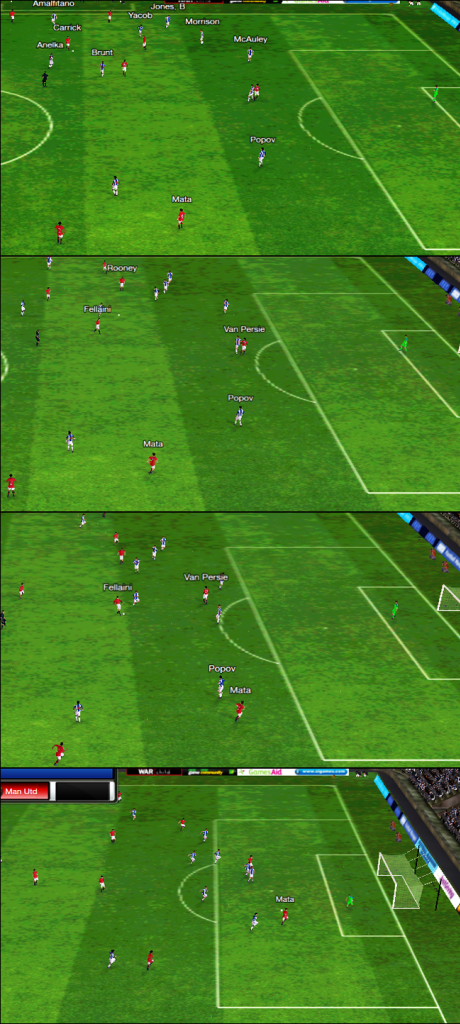 Como podéis ver en esta secuencia completa de la jugada -usad la lupa de Photobucket-, entre Carrick, Rooney y Fellaini sacaron el balón de ese lado y Mata inició el desmarque de ruptura a la espalda de Popov. Con los espacios de los que disponiamos, el pase entre líneas era bastante sencillo lo que provocó que nuestro extremo diestro se quedase mano a mano con el portero, anotando así el 0-1 y dejándonos el partido en una situación muy favorable nada más comenzar.