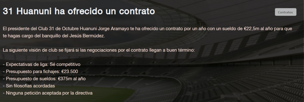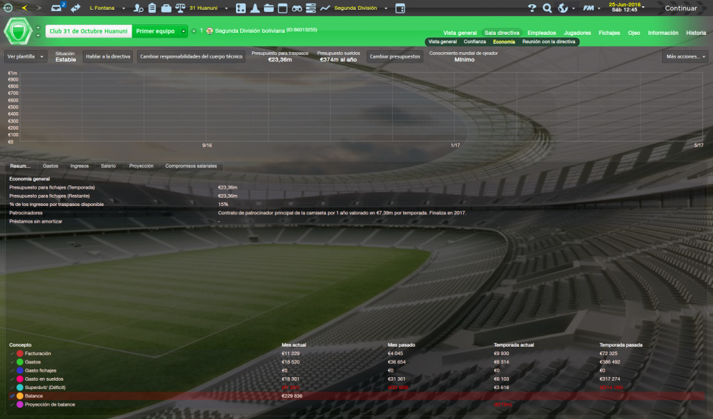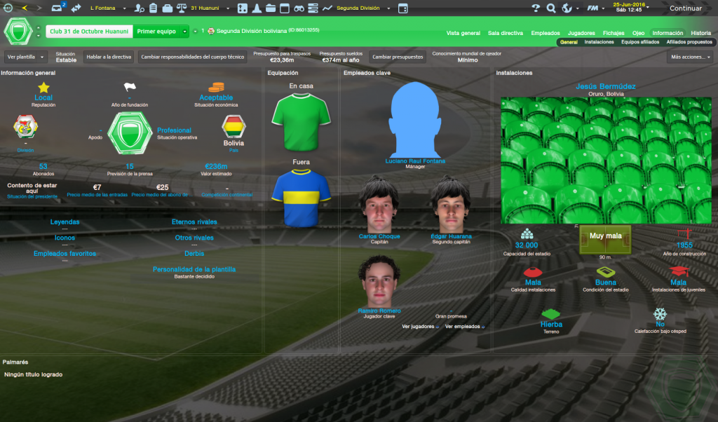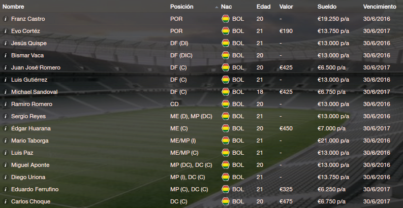 Con este panorama lo lógico era salir de ahí y buscar un nuevo lugar donde cambiar nuestra suerte y esperemos que ese destino propicio sea Bolivia, donde llegamos ahora tras un tiempo muy largo fuera de los banquillos. Segunda división boliviana, me parece acertado el campeonato y el equipo para cambiar nuestro rumbo y comenzar a aspirar a cotas mayores. Es esta primera temporada se puede aspirar a la permanencia. Un club modesto estos bolivianos pero no andan mal en lo económico. La pena es que tendremos que rearmar el equipo con las dificultades que cambiar la plantilla entrañan en divisiones bajas pero a lo mejor logras dar con ese jugador que pueda resultar desequilibrante en el campeonato y logras hacer un buen torneo superando las expectativas que hay puestas.