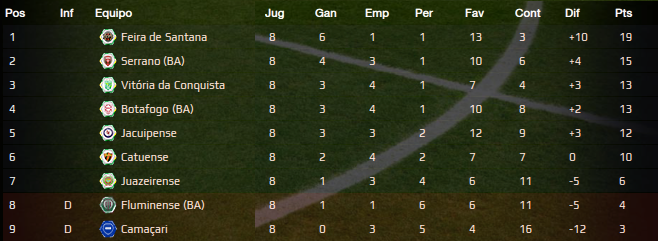 Sabiamos que el formato del estadual podia perjudicarnos, ya que no habia lugar para errores. Los primeros 3 encuentros del torneo fueron derrotas por la minima, que a simple vista pueden engañar por la diferencia, pero en el campo de juego se veia amplio dominio de los rivales, mientras que nosotros, aun teniendo algunas chances, no le acertabamos al arco. Recien en la 4ª fecha logramos rescatar un punto ante el puntero en ese momento, que nos permitia abandonar la ultima posicion. Recien conoceriamos la victoria en la penultima fecha, ante el Camaçari, que estaba junto a nosotros en los puestos de descenso. Fue el mejor partido del equipo en el torneo, y nos permitia abandonar los puestos de descenso a falta de una fecha para terminar el torneo. La ultima fecha, ante el Juazeirense, definiria quien seria uno de los descendidos, ya que el ganador alcanzaba los puntos necesarios para mantenerse, y a nosotros tambien nos servia el empate. El partido fue muy parejo, donde tuvimos chances pero nuestra falta de definicion nos condeno a una derrota que significo el descenso del equipo en el Baianão.
