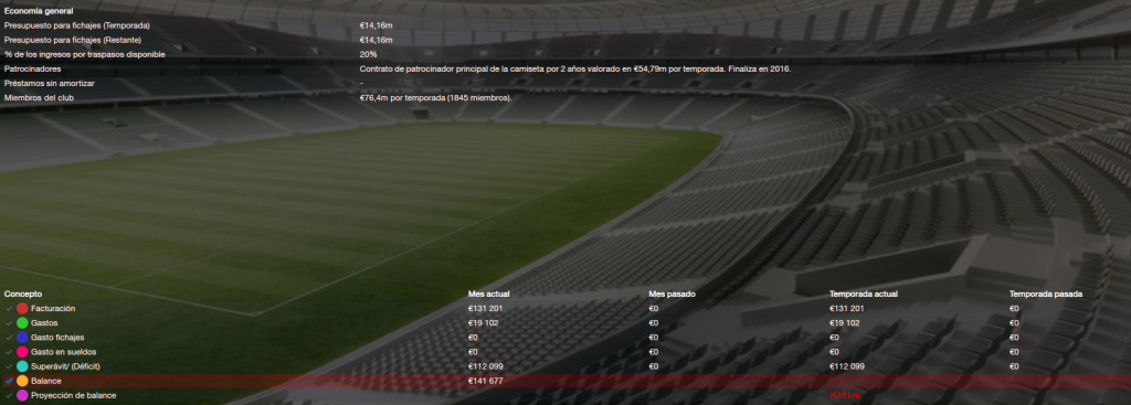 El club cuenta con un balance de €230.000, un balance bastante importante para la division, teniendo en cuenta que los ingresos no son muchos, y algunos de los equipos incluso tiene deudas de la misma magnitud. El sponsor principal del club aporta unos €7.300 por año, que aportaron el 10% de los ingresos de la temporada pasada. Actualmente estamos unos €2.000 pasados en el presupuesto de salarios (€374.500 es el total para el año) mientras que para fichajes tenemos un presupuesto de €23.000, que seguramente pasemos al presupuesto de sueldos ya que no pensamos gastar en fichajes.
