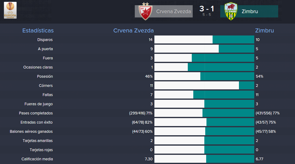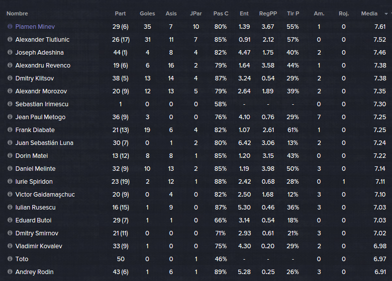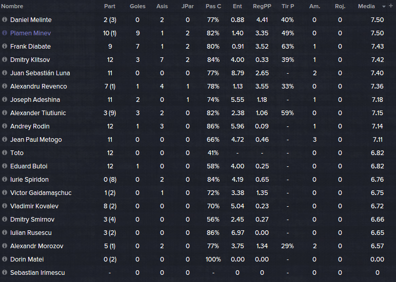 Resultados en Champions. Muy buenos, y sobre todo sin encajar goleadas escandalosas ni hacer el ridículo. Las estadísticas europeas de mis jugadores bastante dignas, en especial Klitsov que ejerció como líder organizador en el centro del campo, demostrando que bien merecería jugar en una liga continental más competitiva que la moldava. Los extranjeros también diferenciales, especialmente los delanteros Minev y Diabaté.