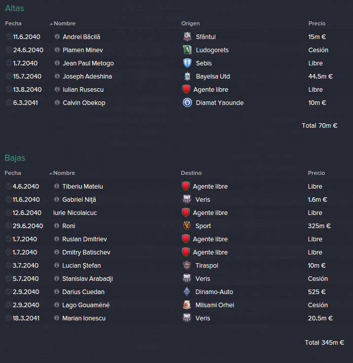 Con la idea de ser más competitivos en Europa, éste año me prodigué un poco más en el mercado de fichajes. Con 4 incorporaciones para el primer plantel, destacando la llegada de dos defensas africanos y un delantero búlgaro a préstamo. Se convertirían en piezas importantes. Pero sin ir en perjuicio de nuestros futbolistas moldavos, pues un año más tuvimos amplia presencia nacional en la configuración del equipo, ya que en el capítulo de ventas hicimos negocio con el carrilero brasileño Roni y también se marchó uno de los delanteros marfileños que no tenía sitio al querer darle sus minutos a varios canteranos.
