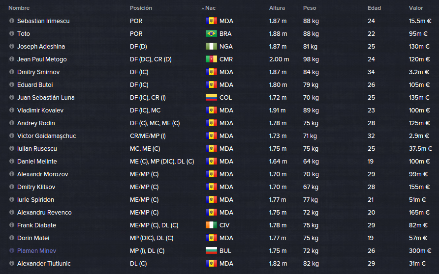 Otra pregunta que se me viene a la cabeza es cuantos Moldavos juegan en mejores ligas y si piensas nacionalizar algún extranjero de nivel como para reforzar las líneas por si la calidad no es la adecuada.
