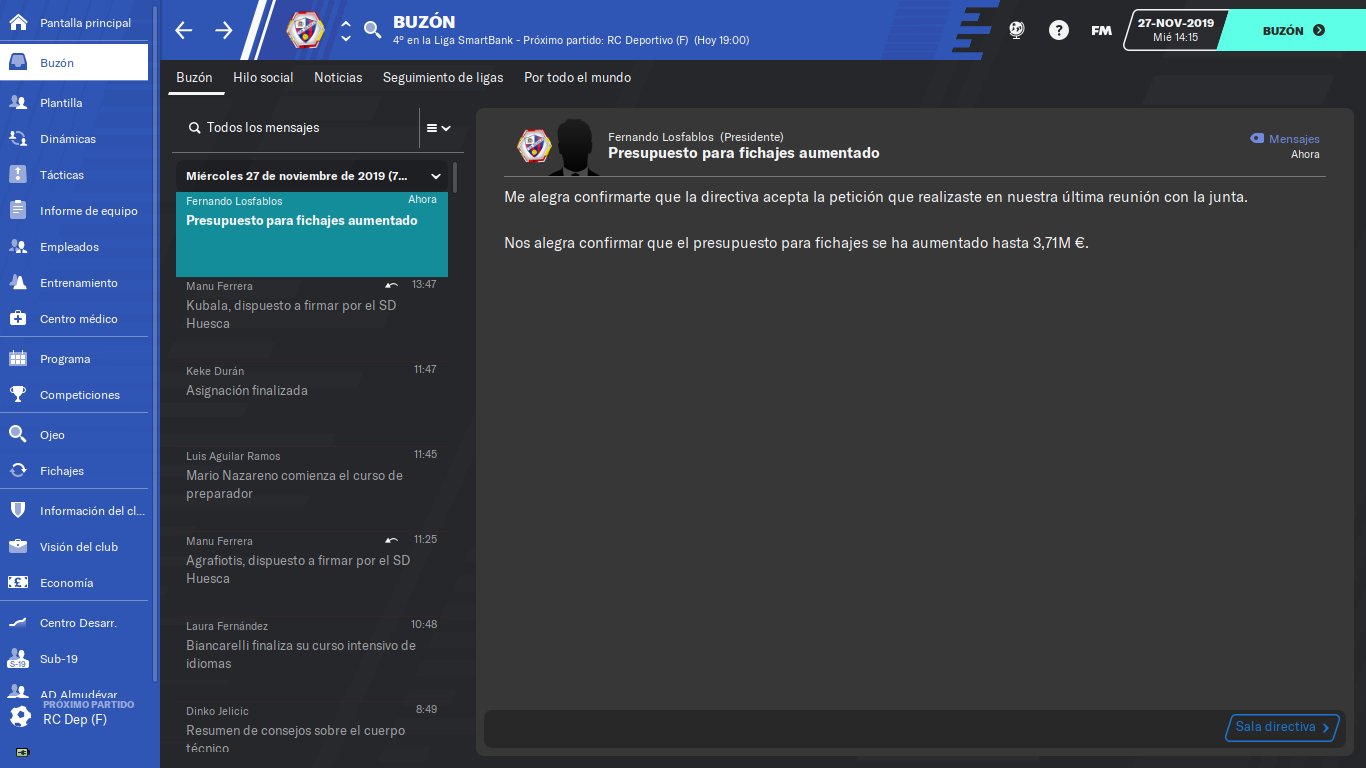 Sin duda, el equipo estaba imparable. Y esto también se demostraba en los despachos, donde la directiva aprobaba las peticiones del joven entrenador español. A su vez, el equipo continuaba con su buena forma tras las victorias contra Tenerife y PonferradinaNo obstante, en el camino también hubo un pequeño tropiezo ante el Zaragoza, donde el equipo perdió por 3-0. Pese a la momentánea derrota, la aparición de jugadores de la Sociedad Deportiva Huesca en el once de la semana ya era una costumbre. Finalmente, tras el emparejamiento contra Osasuna en el sorteo de copa, el equipo derrotó a los rivales en la ida por un total de 5-1.