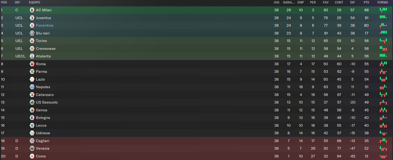 En liga, fuimos capaces de mantener el pulso al Milán durante gran parte de la temporada, llegando a la jornada 31 a solo un punto de los milanistas. Sin embargo, en las últimas 7 jornadas solo fuimos capaces de ganar 2 partidos, al propio Milán y al colista Como, empatando 3 y perdiendo 2, para terminar perdiendo incluso la segunda plaza en la última jornada tras no ser capaces de ganar al Udinese, que terminó solo 3 puntos por encima del descenso