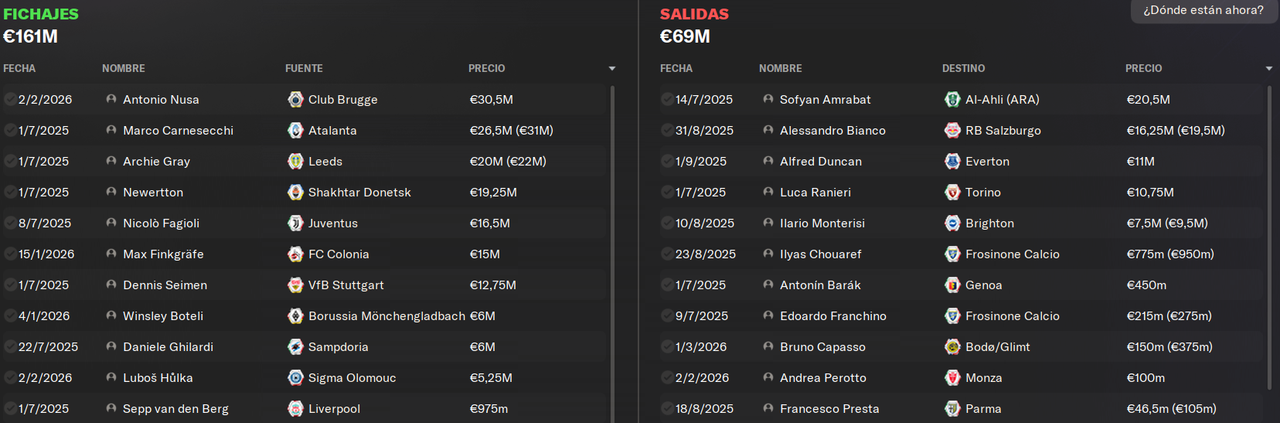 En la segunda temporada a cargo de la Fiorentina, tercera del Reto Carletto, tirabamos la casa por la ventana en el mercado de fichajes en busca de un salto de calidad que nos acercara a la cabeza. Así, con un balance de mas de 90 millones de gasto neto, llegaban al club Antonio Nusa (en el mercado invernal), Marco Carnesecchi, Archie Gray o Newertton, mientras que la salida más destacada era la del hasta entonces pivote titular Sofyan Amrabat, que se marchaba a Arabia por poco más de 20 millones de euros