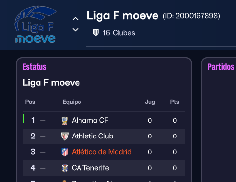 Reitero que no, que son dos clubes distintos. El equipo de Liga F no pertenece al CD Tenerife: es el CD Akeki, que solo tiene un equipo, el de Liga F. Ficha en la Federación Canaria: https://www.federacioncanariafutbol.es/pnfg/NPcd/NFG_VerClub?cod_primaria=1000118&codigo_club=19788 y aviso legal en su propia web para poder recibir las subvenciones: https://clubdeportivotenerifefemenino.com/csd Y los de Primera RFEF y Tercera RFEF son del CD de la Fundación Canaria del CD Tenerife, y por eso en las actas de la RFEF aparece el escudo poniendo «Fundación»: https://rfef.es/es/competiciones/primera-federacion-futfem#novanet-paragraph. El equipo de Primera RFEF se constituye federativamente como el equipo A de la Fundación, y el de Tercera RFEF como el B de la Fundación, como se ve en el hecho de que todas estas jugadoras del Fundación B: https://www.federacioncanariafutbol.es/pnfg/NPcd/NFG_CmpPartido?cod_primaria=1000120&CodActa=26142555&cod_acta=26142555 son las que ellos consideran de su equipo C: https://clubdeportivotenerifefemenino.com/jugadoras/cantera_c Es solo un matiz legal, pero es lo que permite llamar Fundación Tenerife al de Primera RFEF (el hecho de serlo, vaya). Pero nada impide modificar los archivos al gusto y disfrutar del juego como cada uno quiera 😊
